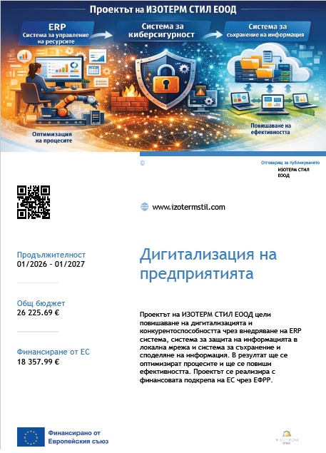 „ИЗОТЕРМ СТИЛ“ ЕООД изпълнява проект № BG16RFPR001-1.012-0138-C01, финансиран по процедура BG16RFPR001-1.012 „Дигитализация на предприятията“ към Програма „Конкурентоспособност и иновации в предприятията“ 2021–2027, съфинансирана от Европейския съюз чрез Европейския фонд за регионално развитие.